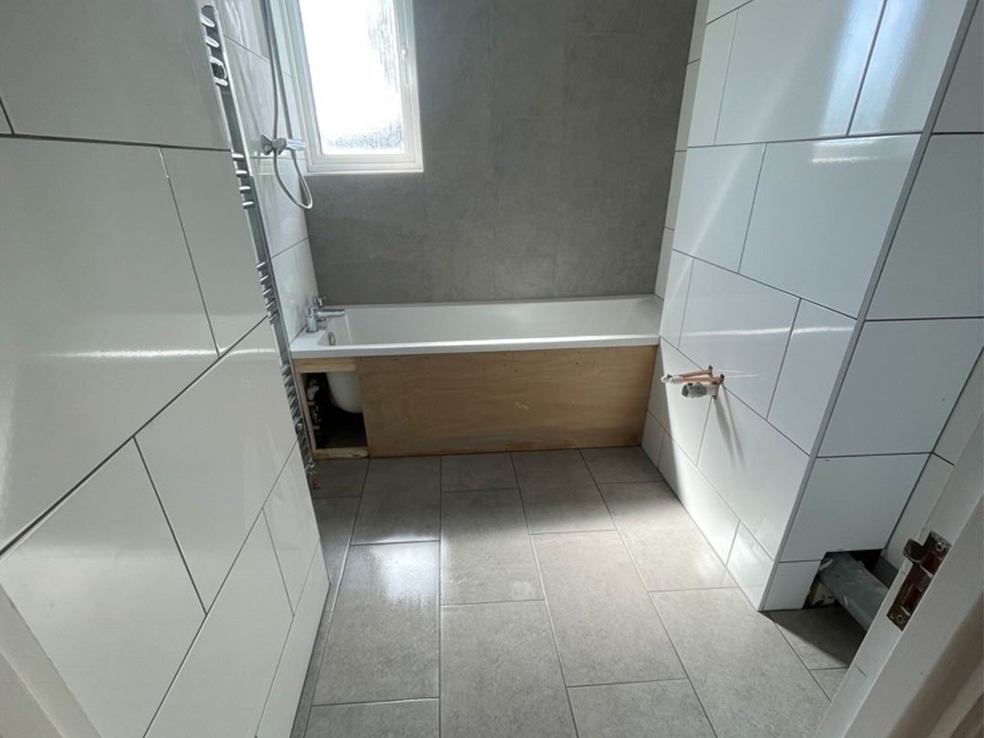 Fully tiled flooring throughout the entire space, offering durability, continuity, and a clean, modern finish